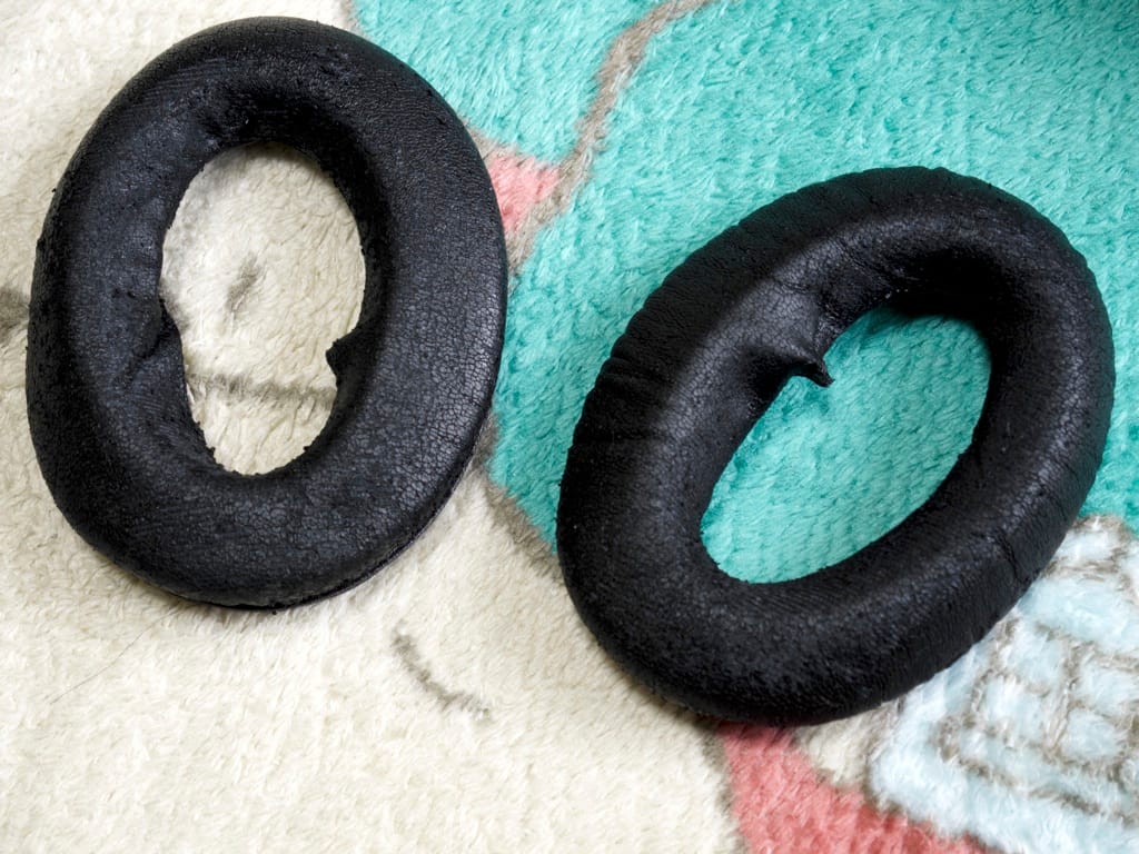 交換後。新品みたいになった。 そして、耳当ては綺麗になったが頭を当てる部分は 生産終了して長いので部品として無くて、 修理に出すとQC15と交換となり 15,000円ぐらいになるらしいので諦めて 表面のゴムコーティングをアルコールで ゴシゴシして拭き取った。