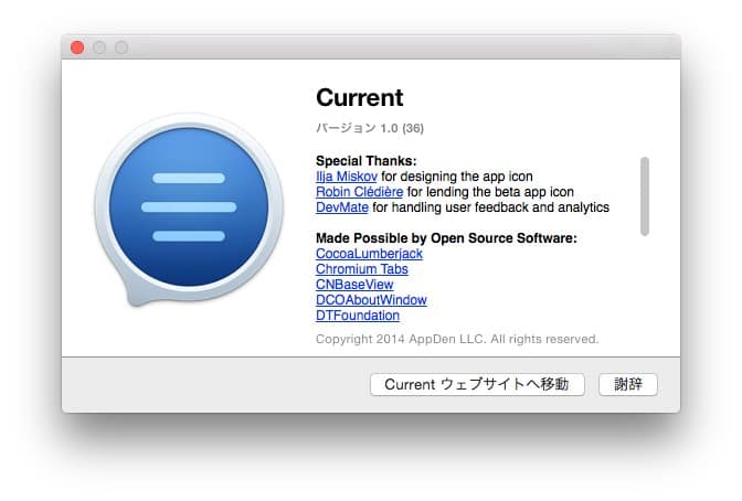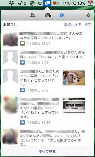 このアプリはメニューバーに小さいアイコン状態で常駐させる事ができFacebookを
