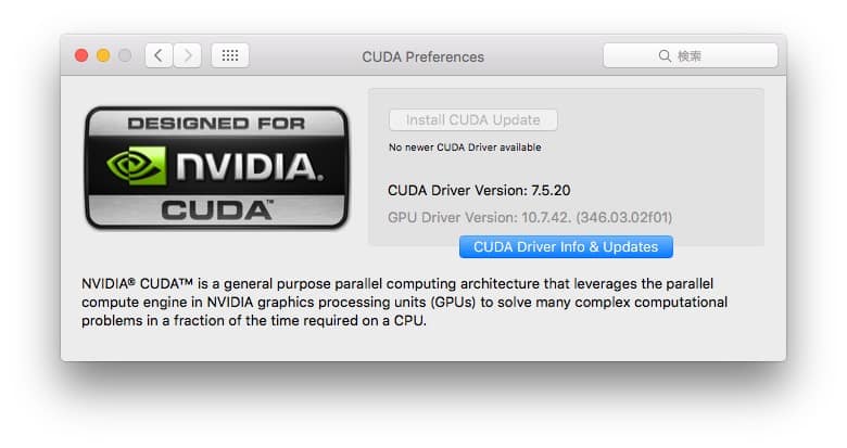 Mac OSX El Capitan (10.11)でCUDAバージョンは7.5.20で最新版。