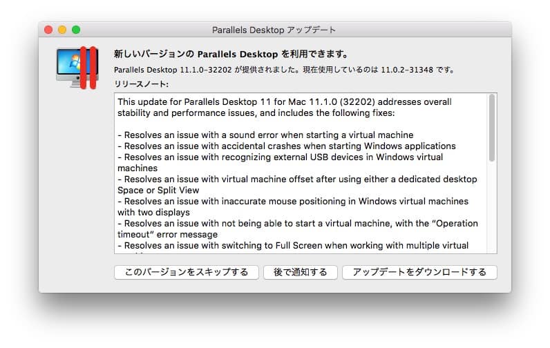 まずは、Parallels Desktop 11 for Macを最新状態にアップデートした。