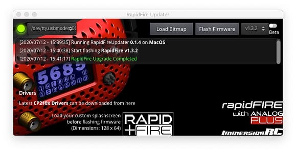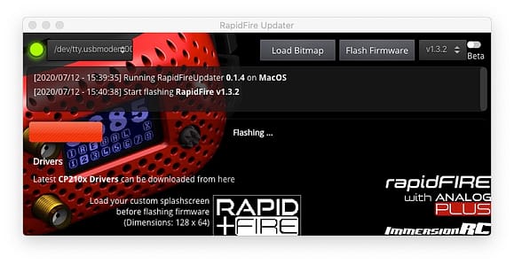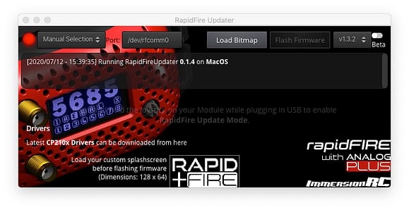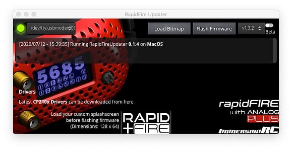 ImmersionRC Rapid Fireのボタンを押しながらパソコンとUSB接続してファームウェア更新モードで起動。
