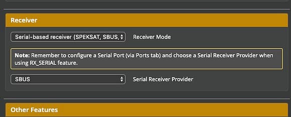 Configureタブで受信器設定をSPIからSBUSに切り替える。