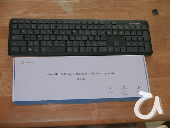 届いた箱をMicrosoft Bluetoothキーボードと並べると小ささがわかるね。