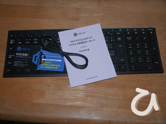 付属品はキーボード本体、充電用USBケーブル、取説、何に使うかわからない会員募集カード。