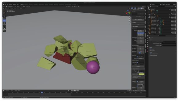 その後、FlipFluidsで液体と干渉する物体として破壊したブロック全てを指示して解析をする。