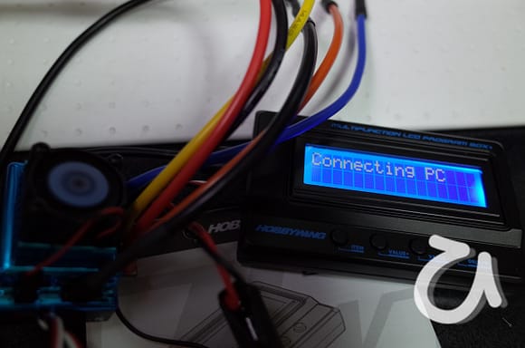 ESCにバッテリーを接続しHOBBYWING LCDプログラムボックスV2にサーボコネクタを接続。