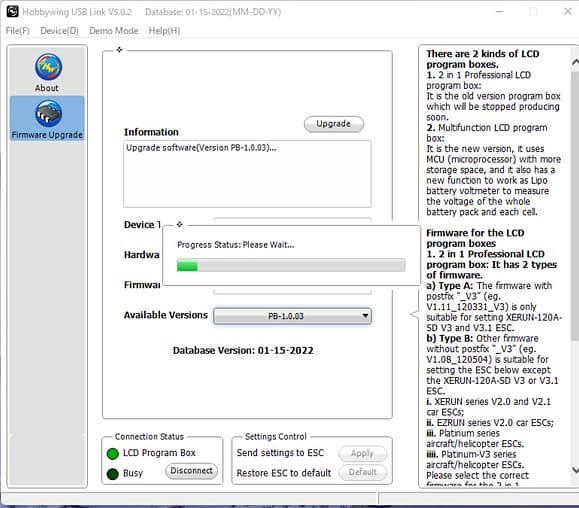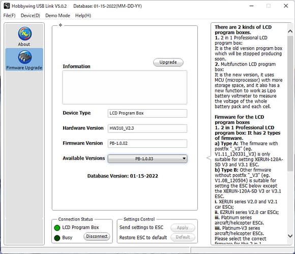 HOBBYWING LCDプログラムボックスV2のファームウェアバージョンなどが表示される。