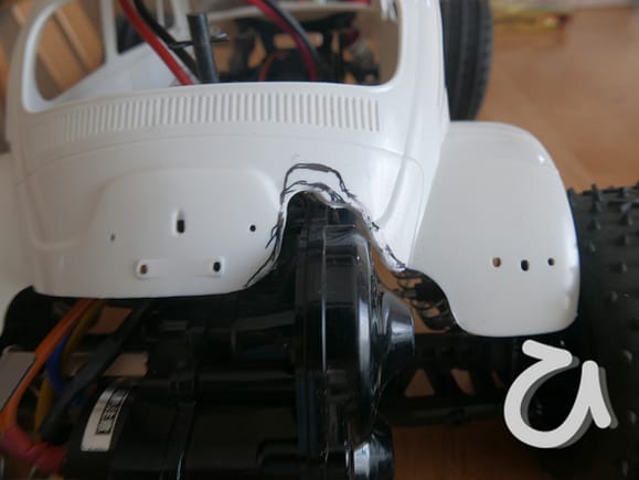 DT-03Tのギアボックスケースとたワーゲンオフローダーボディーの干渉する部分にペンで