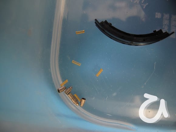 そこを分解すると接触ピンと、それをカメラ側の接触端子に押しつける圧縮ばね各5個がこぼれる。
