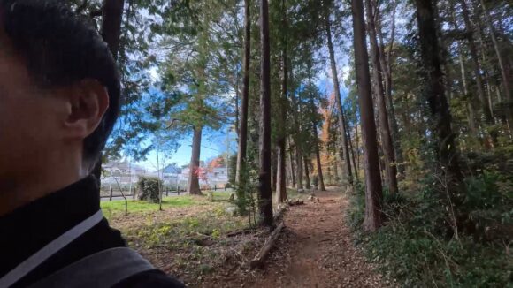 背後からの追走は林の中の遊歩道を歩いていても木々を避けて撮影してくれる。